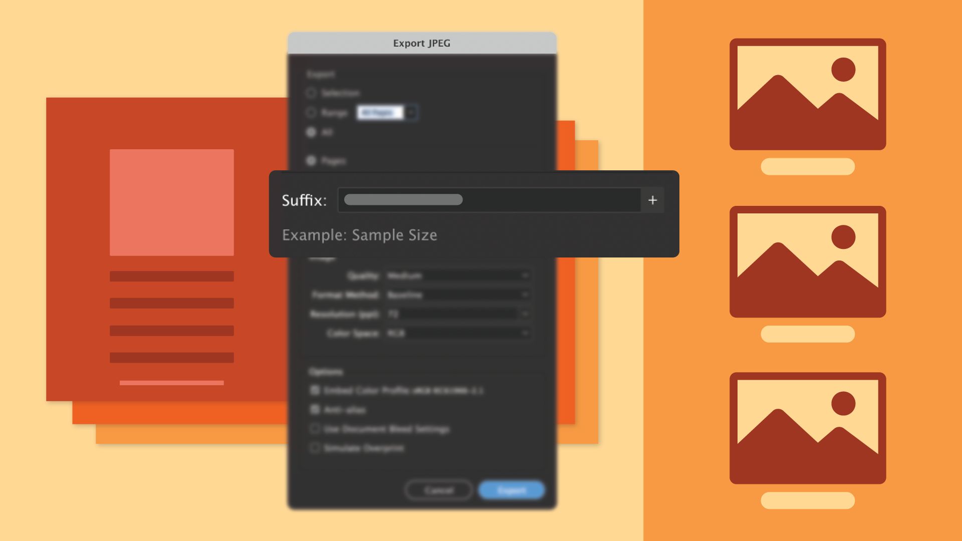 在导出为 JPEG 或 PNG 格式时,添加递增数字、页码和页面大小等后缀。您可以根据后缀区分并轻松筛选以不同大小保存的同一文件,以供不同平台或利益相关者使用。