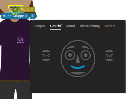- Bei Ebenenparametern (wie den Funktionen „Blinzeln“ und „Mund“ des Gesichtsverhaltens) ist der Parameterwert ein Satz an entsprechenden Marionettenebenen. Wenn beispielsweise die Ebene „Lächeln“ für den Mund gefunden wird, enthält der Parameterwert den Pfad zu dieser Ebene (Kopf/Mund/Lächeln). Falls keine Ebene gefunden wird, bleibt der Wert leer. Anhand dieser Information können Sie feststellen, ob Marionettenebenen nicht wie beabsichtigt verwendet werden.
