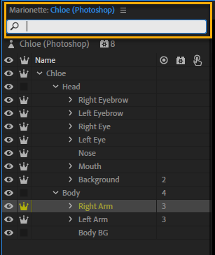 1. Klicken Sie im Marionettenfenster über der Ebenenliste in das Suchfilterfeld. Wenn sich das Fenster im Fokus befindet, können Sie auch „Bearbeiten“ > „Suchen“ (Befehlstaste/Strg+F) verwenden.