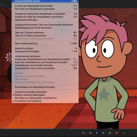 Wenn die Wiedergabe angehalten wird, bleibt der Abspielkopf standardmäßig an der Stelle, an der er zuletzt war. Jedoch können Sie den Abspielkopf wieder an den Startzeitpunkt versetzen, um denselben Zeitbereich zu wiederholen, indem Sie die Leertaste drücken. Diese Option ist hilfreich, wenn Sie das Timing von Mundbildern für ein Wort oder einen Ausdruck genauer festlegen möchten.