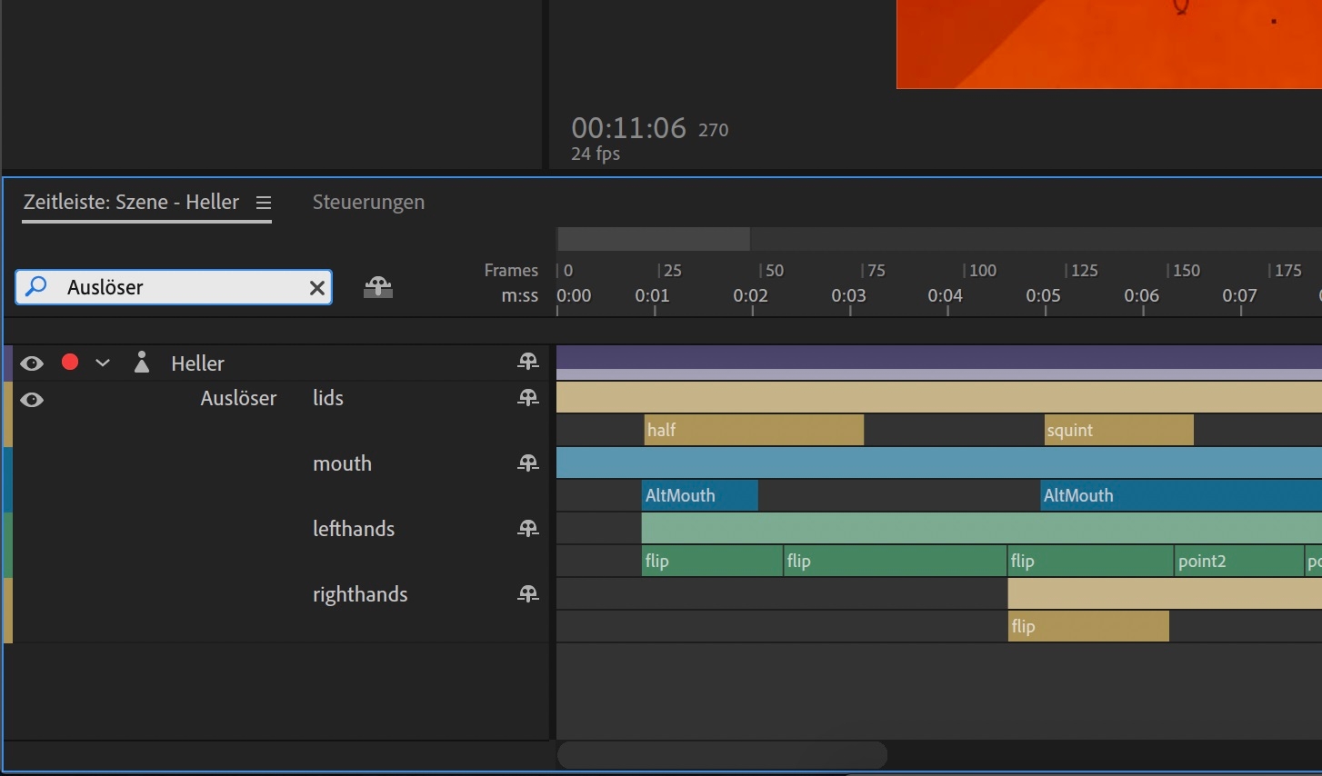 Kombinieren Sie mehrere ausgewählte Lippensynchronisationen oder Auslöser, sodass sie nicht so viel vertikalen Platz in Ihrer Timeline einnehmen. Siehe Takes zusammenführen.