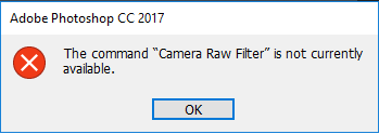 Der Befehl „Camera Raw-Filter ist derzeit nicht verfügbar“.