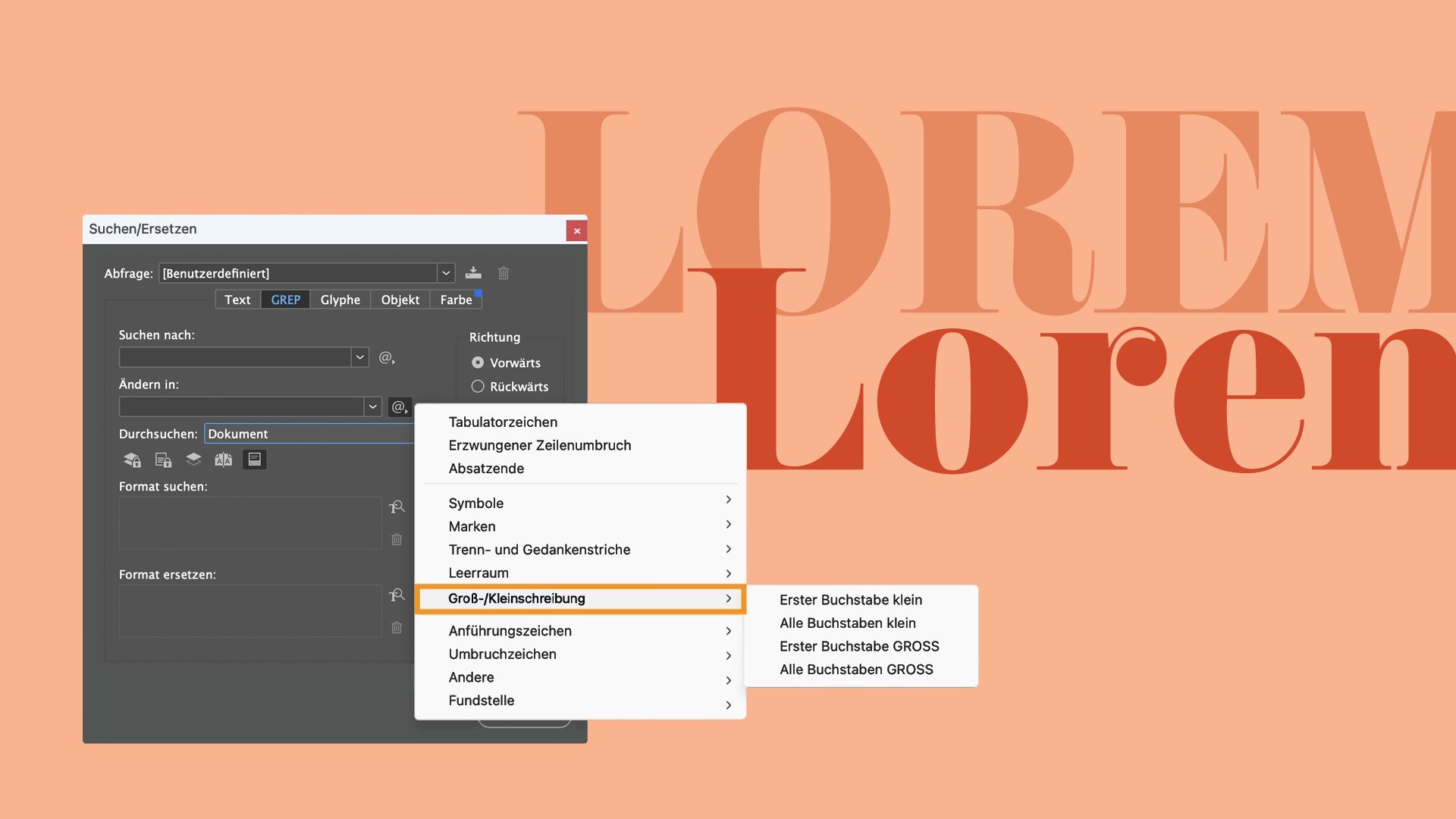 Mit nur wenigen Klicks kannst du die Groß- und Kleinschreibung von Texten ändern und so die Konsistenz deiner Designs sicherstellen. Diese Funktion optimiert die Textbearbeitung und spart dir Zeit und Mühe. Verbessere deinen Workflow, indem du die Groß- und Kleinschreibung von Texten schnell über die Registerkarte Text oder GREP des Bedienfelds Suchen/Ersetzen anpasst.