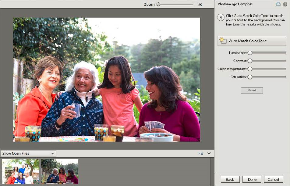 Sie können festlegen, dass die Farbtöne angepasst werden, damit die eingefügte Auswahl und das Zielbild zusammenpassen und die Änderung natürlich aussieht. Sie können zwischen dem Modus zur automatischen Abstimmung und Schiebereglern zur manuellen Abstimmung des Farbtons wählen.