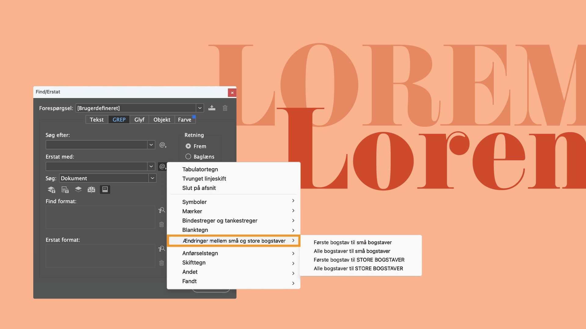 Du kan nemt skifte mellem små og store bogstaver med et par klik, så dine design fremstår ensartede. Med denne funktion forenkles tekstredigeringen, så du skal bruge mindre tid og færre kræfter på det. Få et bedre arbejdsforløb ved hurtigt at justere store og små bogstaver fra fanerne Tekst eller GREP på panelet Find/Erstat.