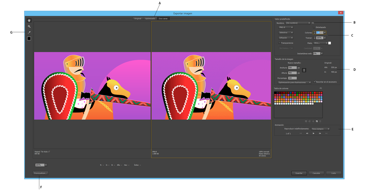 Haga clic en una ficha situada en la parte superior del cuadro de diálogo Exportar imagen o Exportar GIF animado para seleccionar una opción de visualización: Optimizado o 2 copias.