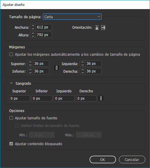 Seleccione Ajustar los márgenes automáticamente a los cambios de tamaño de página para ajustar dinámicamente los márgenes con los cambios realizados en el tamaño de página, o introduzca los valores de los márgenes manualmente.