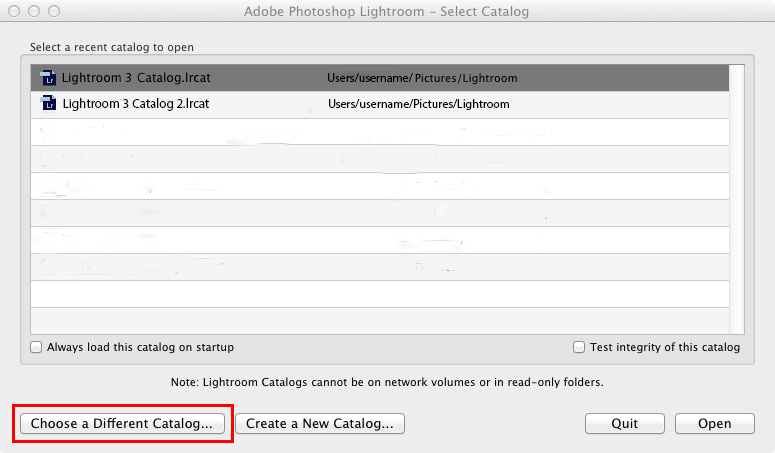 El siguiente cuadro de diálogo que aparece muestra una lista de los catálogos que Lightroom Classic ve inicialmente. Si el catálogo no está en la lista, haga clic en Elegir un catálogo diferente.