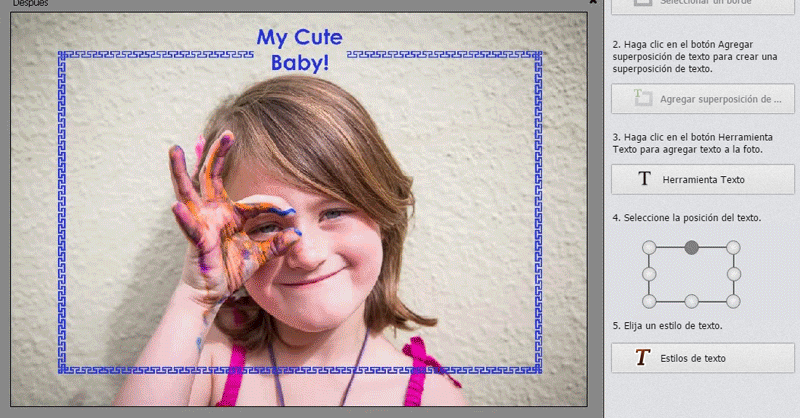 Agregue a sus fotos bordes con estilo y un texto que cuente su historia. Utilice la edición guiada de superposición de texto y borde para dar un nuevo look a sus fotografías con una combinación de bordes pulidos y texto.
