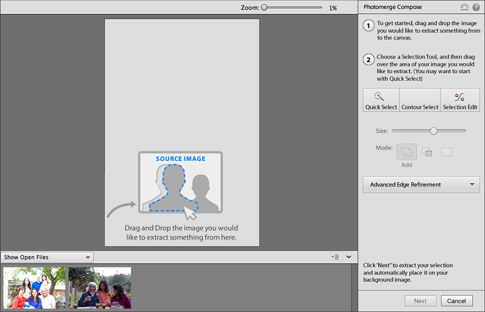La función Composición de Photomerge permite sustituir partes de una imagen. Por ejemplo, puede cambiar el fondo de una imagen. Se necesitan dos imágenes: una de origen y una de destino. Puede seleccionar un área, recortarla de la imagen de origen y, a continuación, pegarla en la imagen de destino.