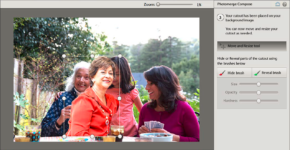 Pegue la selección en el destino. Puede mover o cambiar el tamaño de la selección. También puede ocultar/mostrar partes de la selección con los pinceles disponibles.