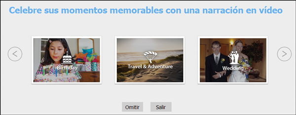 Puede utilizar sus fotografías y vídeos para crear una narración con impacto de un evento memorable. La opción Narración en vídeo del menú Crear le ayuda a presentar las fotografías y los vídeos de un evento (por ejemplo, una boda) en un formato de narración mediante un flujo de trabajo estructurado paso a paso. Se le guiará por una secuencia para organizar sus recursos en capítulos y agregar diálogo, subtítulos, música y otros elementos.