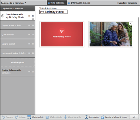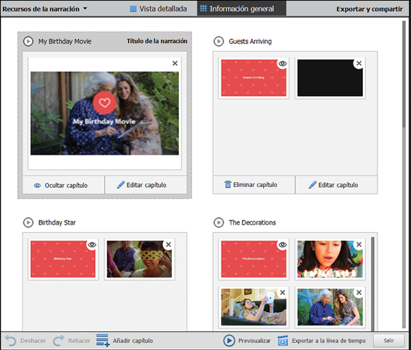 Organice los vídeos y las fotografías para estructurar y organizar su narración en vídeo en capítulos. Arrastre recursos de la narración del panel de la izquierda y colóquelos en el capítulo apropiado. Por ejemplo, arrastre el material de archivo anterior a la fiesta y colóquelo en el capítulo Preparativos de la fiesta. Otras funciones que puede realizar en la vista de información general de la narración son: