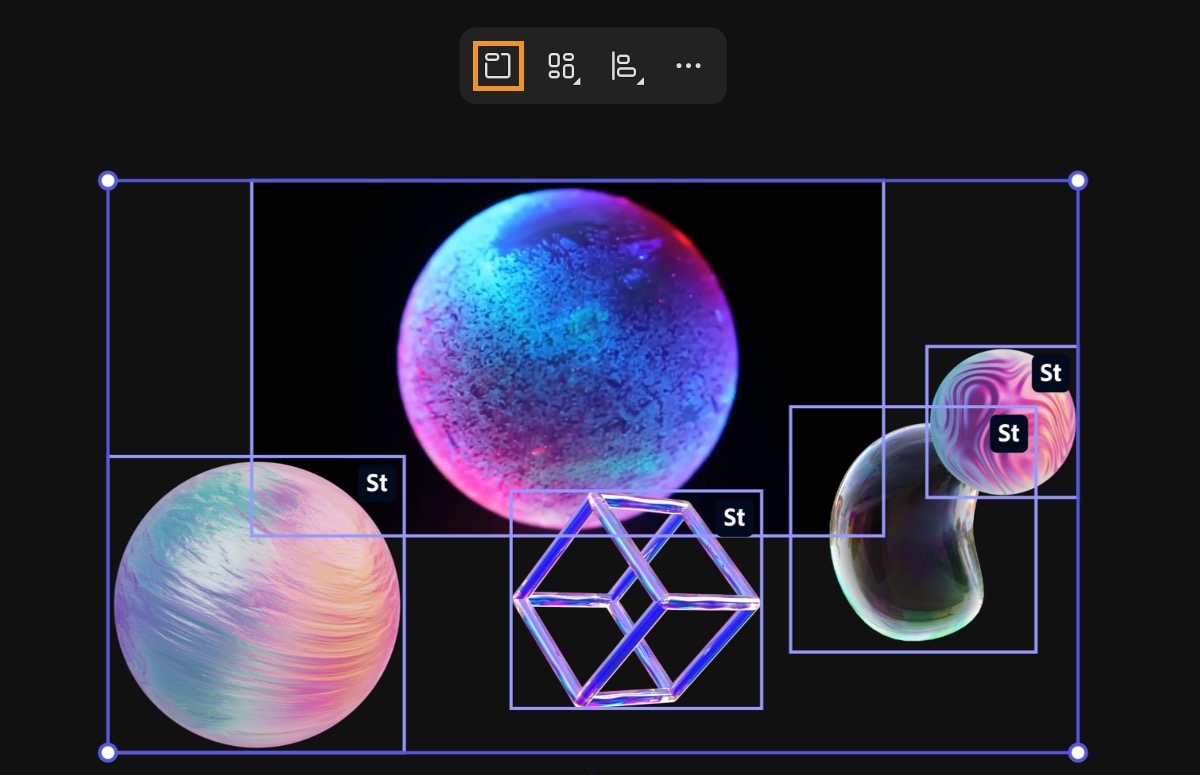 Vie hiiren osoitin pikavalikon Järjestä-kuvakkeen päälle ja valitse, järjestetäänkö valitut elementit riveihin, sarakkeisiin vai mosaiikkimuotoon.