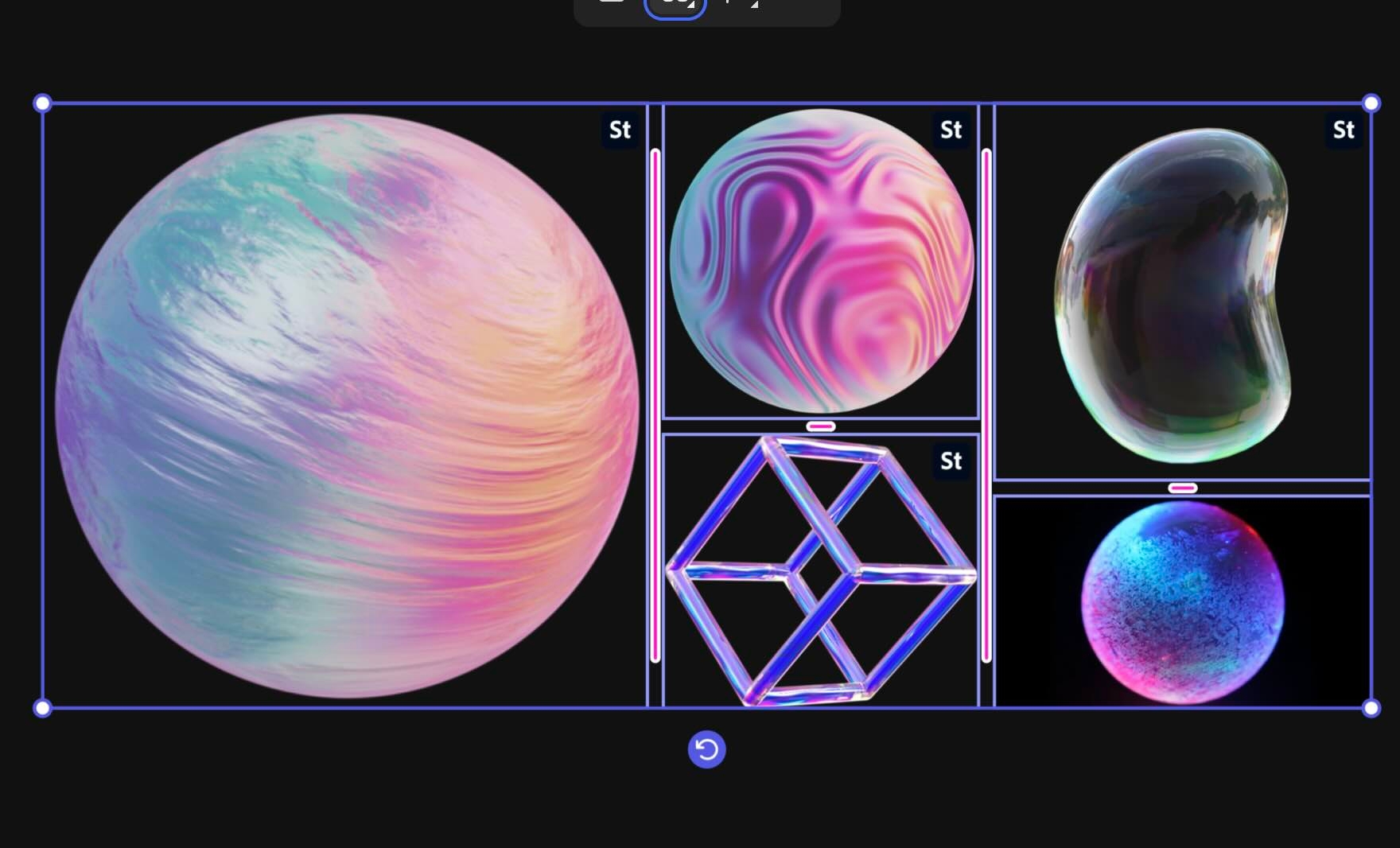 Voit koota kaikki visuaaliset elementit, kuten kuvat, värit ja videot, keskitetysti piirtoalueelle valitsemalla Firefly-taulut-toiminnossa Kerää kohteet. Sovellus kokoaa elementit piirtoalustalle ruudukkomuotoon ja järjestää ne automaattisesti katsomaansa sopivaan järjestykseen.