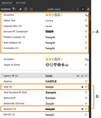 Löydät usein käyttämäsi kirjasimet nopeasti merkitsemällä yksittäisiä kirjasinperheitä tähdellä suosikeiksi tai valitsemalla niitä kirjasinluettelon alussa näkyvistä viimeksi käytetyistä kirjasimista. Viimeksi käytetyt ja tähdellä merkityt kirjasimet säilyvät InCopy-istuntojen välillä.