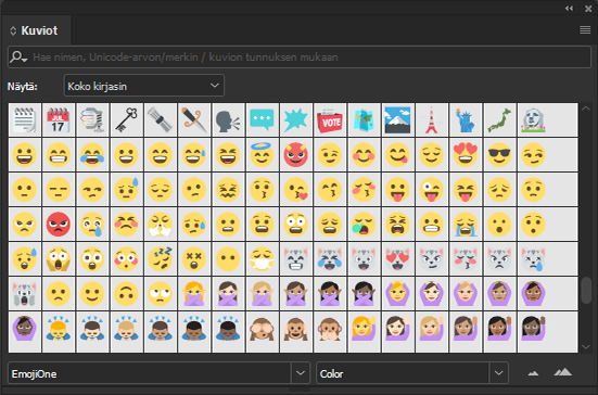 Käyttämällä emoji-kirjasimia voit lisätä dokumentteihin monenlaisia värikkäitä ja graafisia hahmoja, kuten hymiöitä, lippuja, tienviittoja, eläimiä, ihmisiä, ruokia ja maamerkkejä. OpenType SVG -emoji-kirjasimilla, kuten EmojiOne-kirjasimella, voit luoda kuvioista tietynlaisia yhdistelmäkuvioita. Voit luoda esimerkiksi eri maiden lippuja tai vaihtaa tiettyjen oletushahmojen ja -ruumiinosien, kuten käsien, ihonvärin.