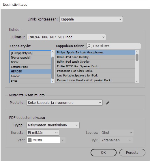 • Valitse Tyyppi > Hyperlinkit ja ristiviittaukset > Ristiviittausasetukset.