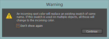 Jos nyt tuot tiedostoja, joiden spottivärikanavalla on sama nimi kuin julkaisussasi olevalla spottivärillä, näyttöön tulee seuraava varoitus: