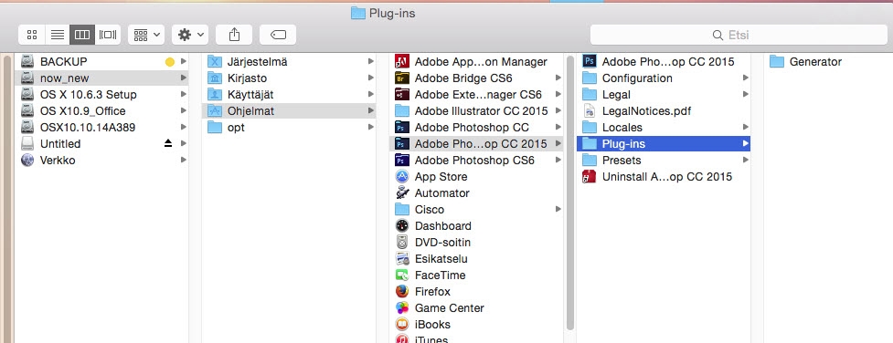 - Poista Plug-in- ja Generator-kansio: siirry kansioon /Applications/Adobe Photoshop CC 2022/Plug-ins/ ja poista Generator-kansio ja AdobeDesigntoPrint.plugin