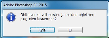 Pidä vaihtonäppäintä painettuna ja käynnistä Photoshop. Käynnistyksen aikana näyttöön tulee valintaikkuna, jossa lukee: ”Ohitetaanko valinnaisten ja kolmannen osapuolen laajennusten lataaminen?”