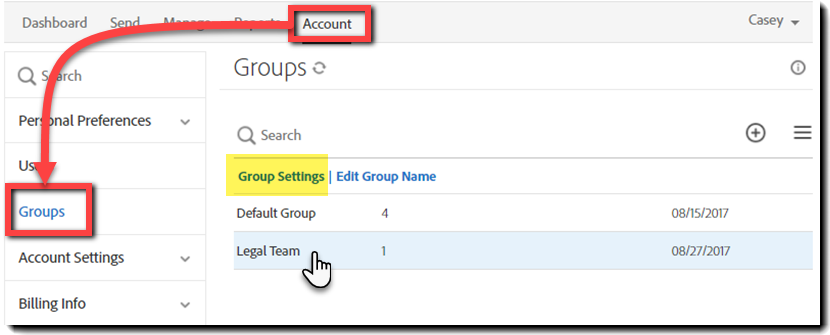 Business- ja Enterprise-tason Adobe Acrobat Sign -tileillä on pääsy Ryhmä-toimintoon. Ryhmät mahdollistavat erillisten käyttäjien osajoukkojen luomisen. Niille voidaan antaa oikeus eri kirjastodokumentteihin ja asetuksiin (kuten logoihin ja Cc-kopioiden vastaanottajiin).