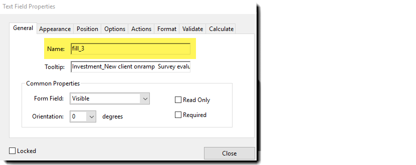 Jos käytät Acrobatin automaattisesti sijoittamia kenttiä, kenttiesi nimistä tulee pelkästään yksinkertaisia kuvailevia merkkijonoja. (Jos ne eivät ole merkityksellisiä, on suositeltavaa, että näet vaivaa tehdäksesi niistä sellaisia.)