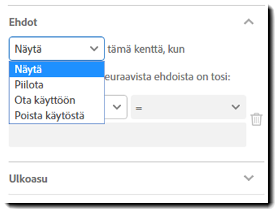 Tämä asetus määrittää, näytetäänkö, piilotetaanko vai poistetaanko kenttä käytöstä, kun ehto täyttyy.