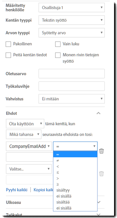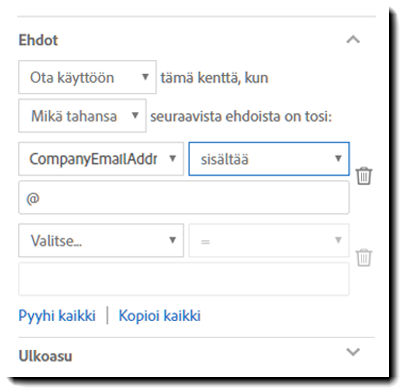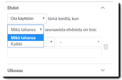 Voit määrittää ehtoja, joilla eri kentät vaikuttavat toisiinsa.