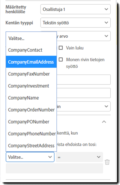 Dokumentissa on oltava vähintään kaksi kenttää, jotta Ehdot-asetus olisi käytettävissä.