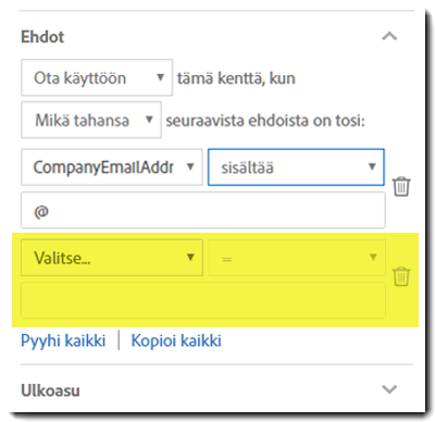 Voit määrittää yhdelle kentälle useita käynnistimiä ehdon mikä tahansa- tai kaikki-vaihtoehtoja varten. Kun yksi ehto on paikallaan, asiakirjaan lisätään uusi tyhjä ehto.