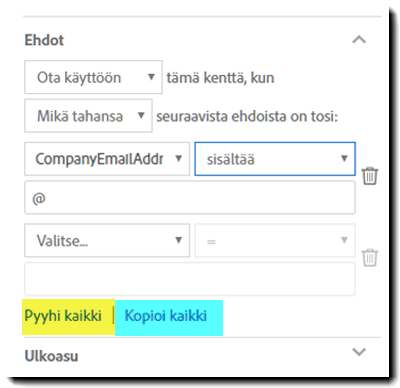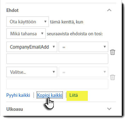 Kun ehdot on kopioitu, kaikkiin ehtoja tukeviin kenttiin tulee Liitä-painike. Jos kentälle ei ole määritetty mitään ehtoja, kaikki ehdot liitetään kenttään.