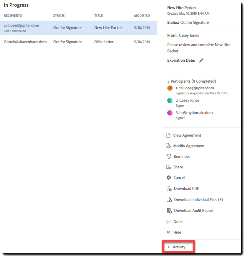 - Lisää vaihtoehtoinen vastaanottaja – Kun lisätään vaihtoehtoinen vastaanottaja, sopimuksessa on alkuperäisen vastaanottajan lisäksi uusi vastaanottaja, joka voi viimeistellä sopimuksen.