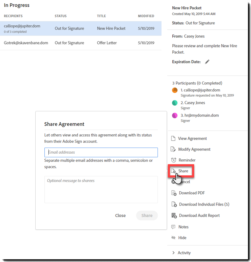 - Anna sähköpostiosoitteet, joiden kanssa haluat jakaa sopimuksen.