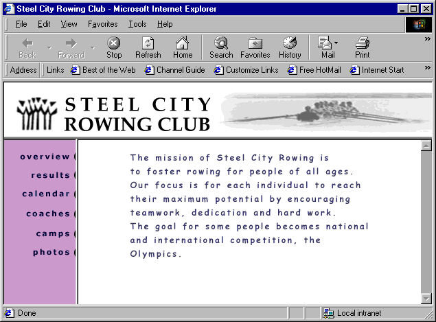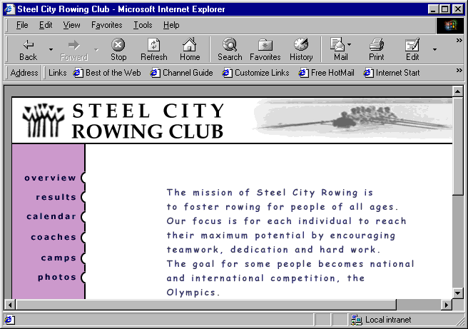 Dans la plupart des cas, vous pouvez créer une page web sans cadre qui permet d’obtenir les mêmes résultats qu’avec un jeu de cadres. Par exemple, si vous voulez afficher une barre de navigation à gauche de la page, vous pouvez remplacer la page par un jeu de cadres ou simplement inclure la barre de navigation sur chacune des pages du site (Dreamweaver vous permet de créer plusieurs pages à la mise en forme identique.) Dans l’exemple suivant, la mise en forme de la page ressemble à une mise en forme avec cadres, mais elle n’en contient pas.