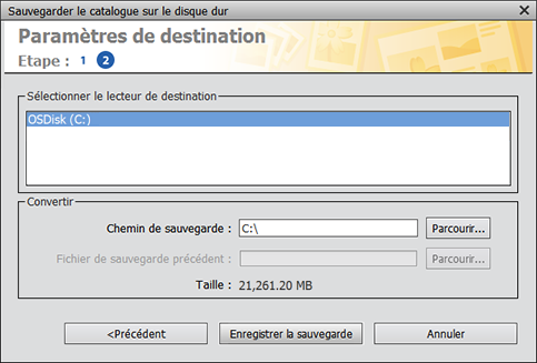 Cette option permet de créer une copie de tout le catalogue, de tous les fichiers photo et vidéo, les clips audio, les fichiers PDF, les projets et autres fichiers associés. Choisissez cette option au moins à la première sauvegarde de vos fichiers.