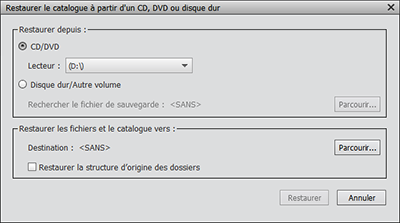 Lors de la restauration d’un catalogue sauvegardé, son contenu est recréé sur votre ordinateur. Entre autres utilités, la restauration d’un catalogue permet de récupérer des fichiers perdus, ou de déplacer les fichiers sur plusieurs ordinateurs.