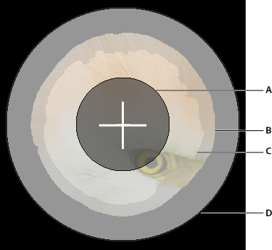 • A - Cercle intérieur du curseur, dans lequel la zone de sélection commence à s’agrandir. La zone comprise dans ce cercle est automatiquement sélectionnée.