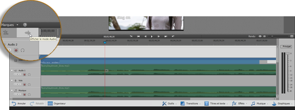 Pour travailler sur les pistes audio, cliquez sur Afficher le mode Audio en haut du montage en mode Expert (ou appuyez sur Maj + A).