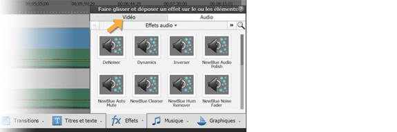 Pour en faciliter l’accès, les outils, les transitions et les effets à votre disposition dans la barre d’actions sont désormais classés en catégories audio et vidéo.