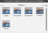 Par exemple, la catégorie Netteté contient des effets qui permettent d’altérer la clarté ou la mise au point d’une image, tels que Flou accéléré et Plus net.