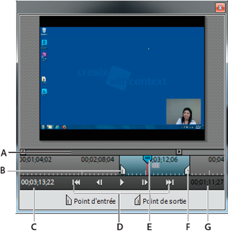 A. Commande de zoom B. Point d’entrée de l’élément C. Instant présent D. Commandes de lecture E. Indicateur d’instant présent F. Point de sortie de l’élément G. Durée d’un élément