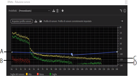 A. Trascina i punti di controllo per variare la riduzione in diversi intervalli di frequenza. B. Rumore con ampiezza bassa C. Rumore con ampiezza elevata D. Soglia al di sotto della quale si applica la riduzione del rumore