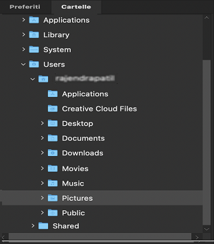 I contenuti multimediali selezionati vengono importati in Adobe Bridge. Per impostazione predefinita, i file multimediali di Bridge vengono importati in /Utenti/<nome utente>/Immagini. Potete trovare questa cartella nel pannello Cartelle.