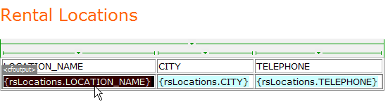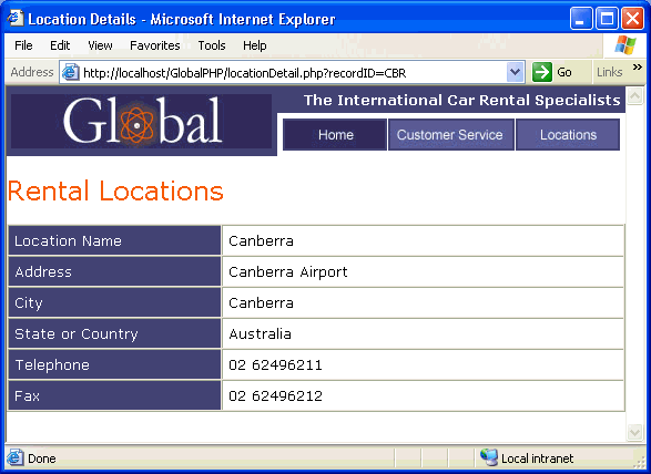 Quando la pagina viene eseguita, i valori del campo CODE del recordset vengono inseriti nelle righe corrispondenti della tabella dinamica. Ad esempio, se la sede dell'autonoleggio di Canberra (Australia) ha il codice CBR, l'URL seguente viene utilizzato nella riga Canberra della tabella dinamica: