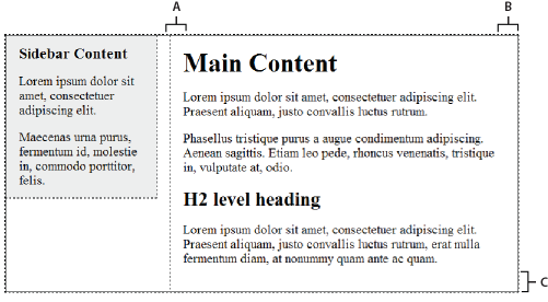 l'esempio di codice precedente è una versione semplificata del codice che crea il layout con due colonne fisse e barra laterale sinistra quando create un nuovo documento mediante i layout predefiniti forniti con Dreamweaver.