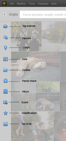 Potete eseguire una ricerca diretta dei file multimediali digitando il testo nella barra Testo. Digitate un nome o una parola: in Elements Organizer vengono visualizzati i file multimediali contenenti questo testo in base a diversi criteri. Elements Organizer offre inoltre dei suggerimenti durante la digitazione in base a persone, luoghi, eventi, tag avanzati e così via presenti nel catalogo. Ad esempio, se digitate “D”, vengono visualizzati persone, luoghi, eventi, ecc che iniziano con la lettera “D”.