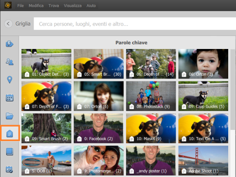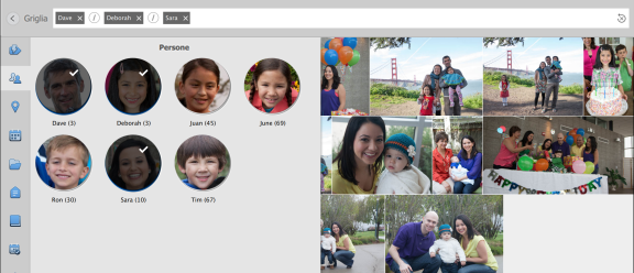 Quando si esegue una ricerca di più entità all’interno di una categoria, il risultato della ricerca mostra tutti i file multimediali che contengono una o più entità tra quelle specificate. A titolo illustrativo, nell’esempio precedente avete cercato nel pannello Persone immagini che includevano Deborah, Dave o Sarah. In questo caso, venivano visualizzate tutte le immagini in cui erano presenti una (o più) di queste persone.