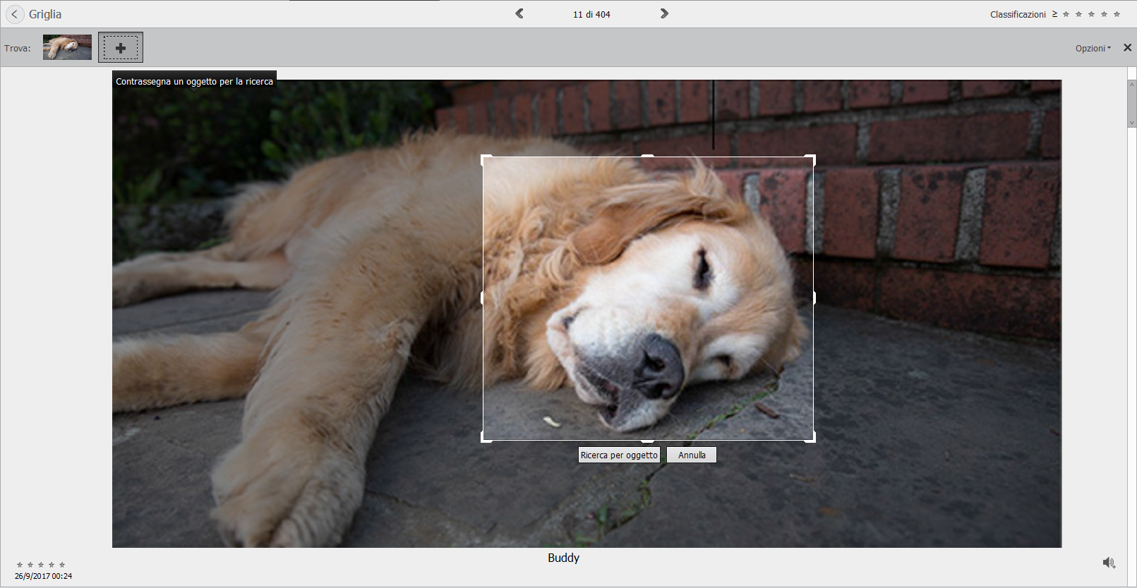 Dal menu Trova, selezionate Per ricerche visive > Oggetti presenti nelle foto. La visualizzazione per singola immagine presenta un rettangolo di selezione.