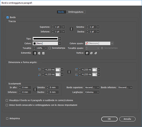 Selezionate Sovrastampa traccia se il filetto del paragrafo verrà stampato su un altro colore e desiderate evitare errori di registro nella stampa, quindi fate clic su OK.
